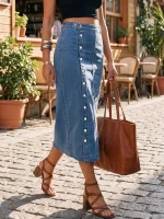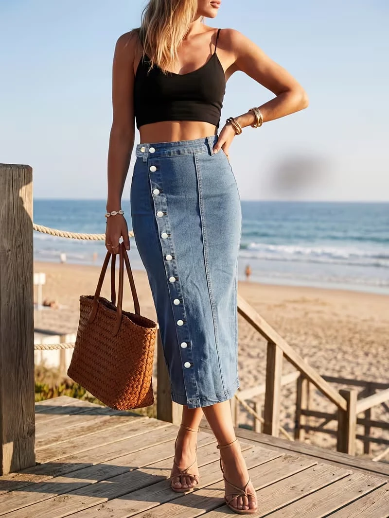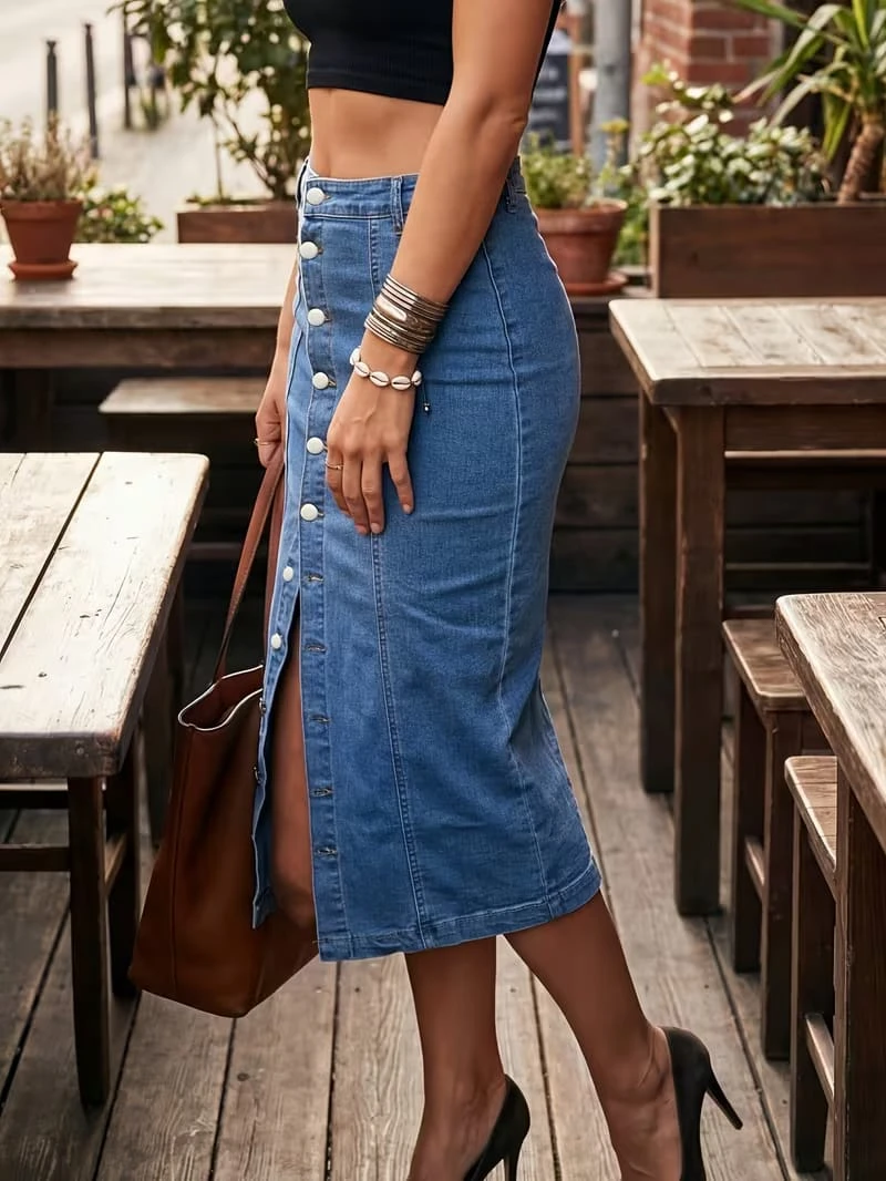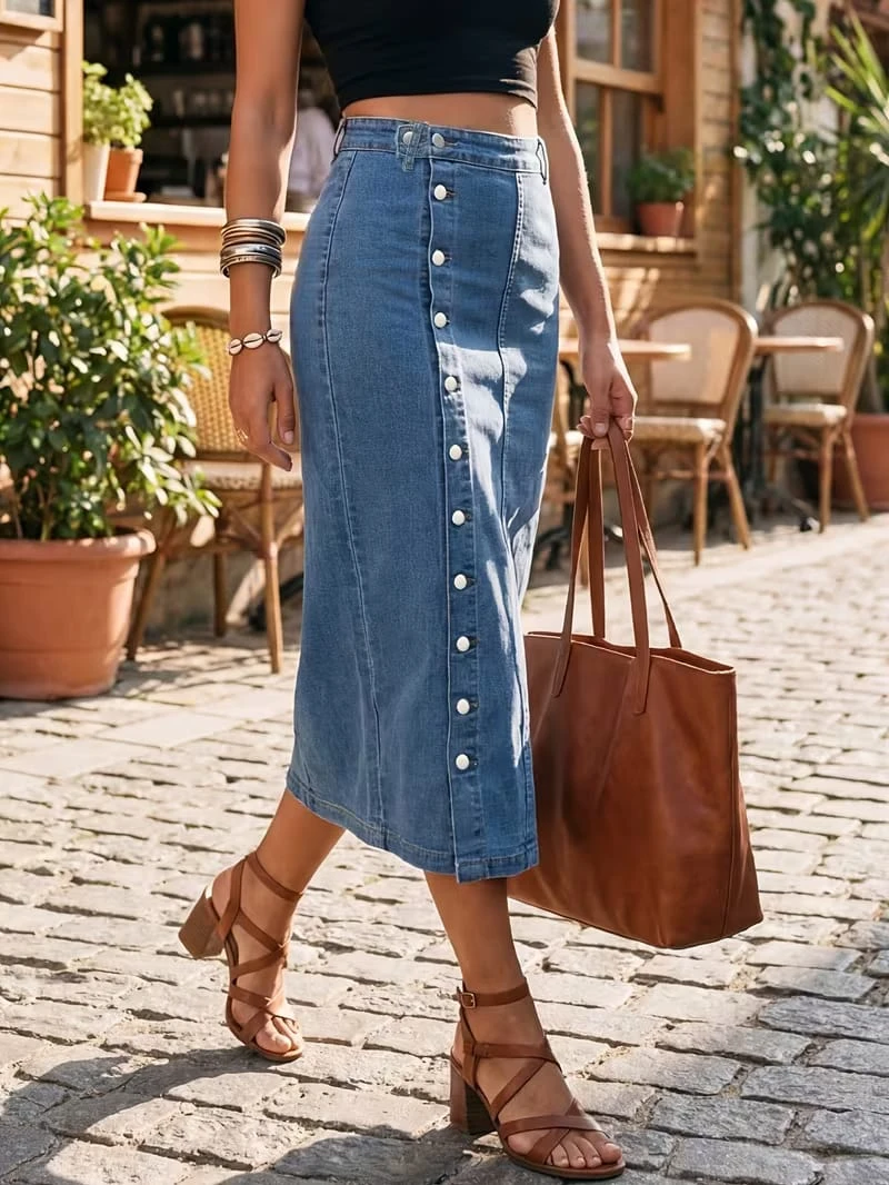 Premium Women’s Blue Denim Button-Front Midi Skirt – Stylish & Elegant Everyday Wear