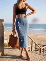 Pair this blue denim midi skirt with a fitted top and heels for a chic look or sneakers for a relaxed casual vibe.